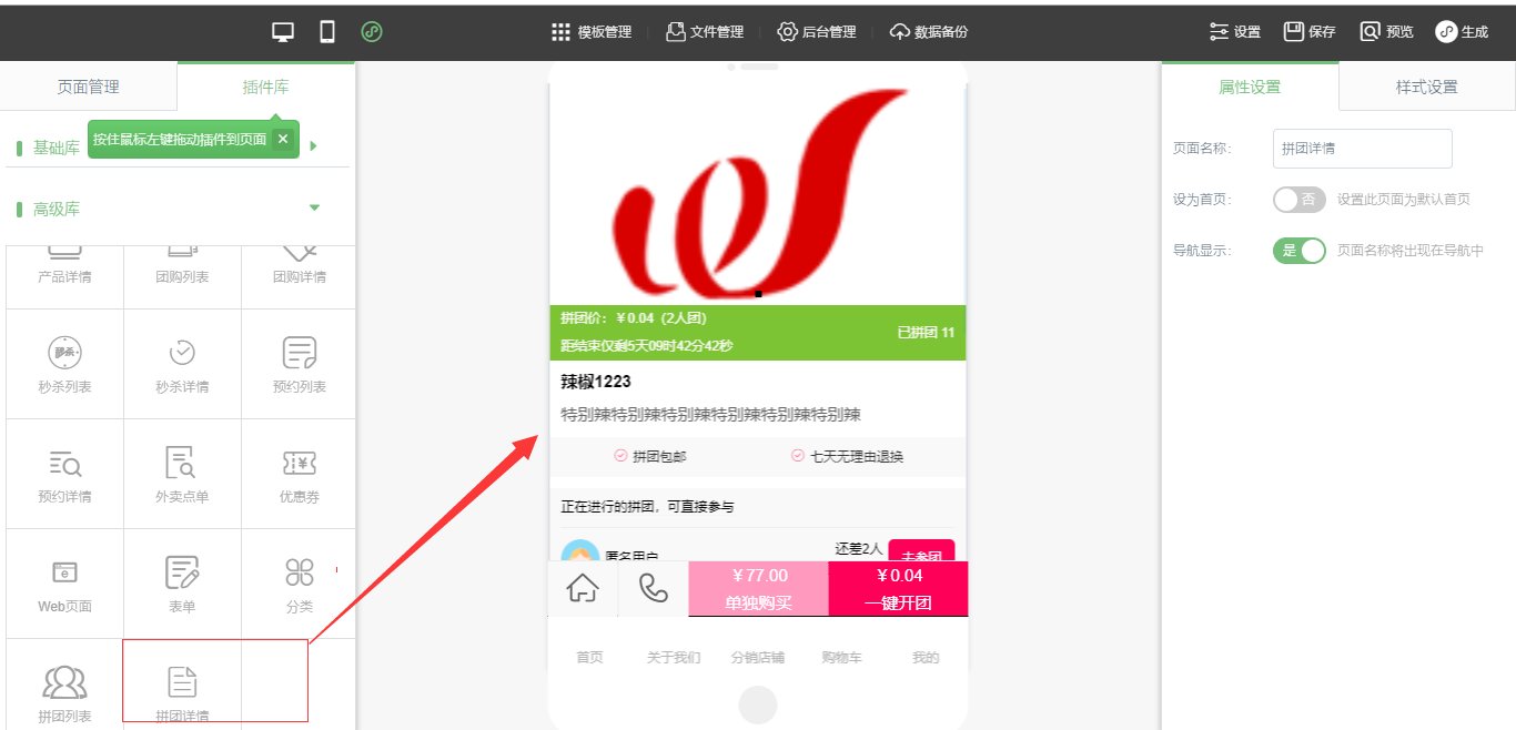 2.在小程序编辑器中,拖入“拼团列表”以及“拼团详情”,在“属性设置”与“样式设置”中设置好页面所需的样式,点击保存即可,如图所示: